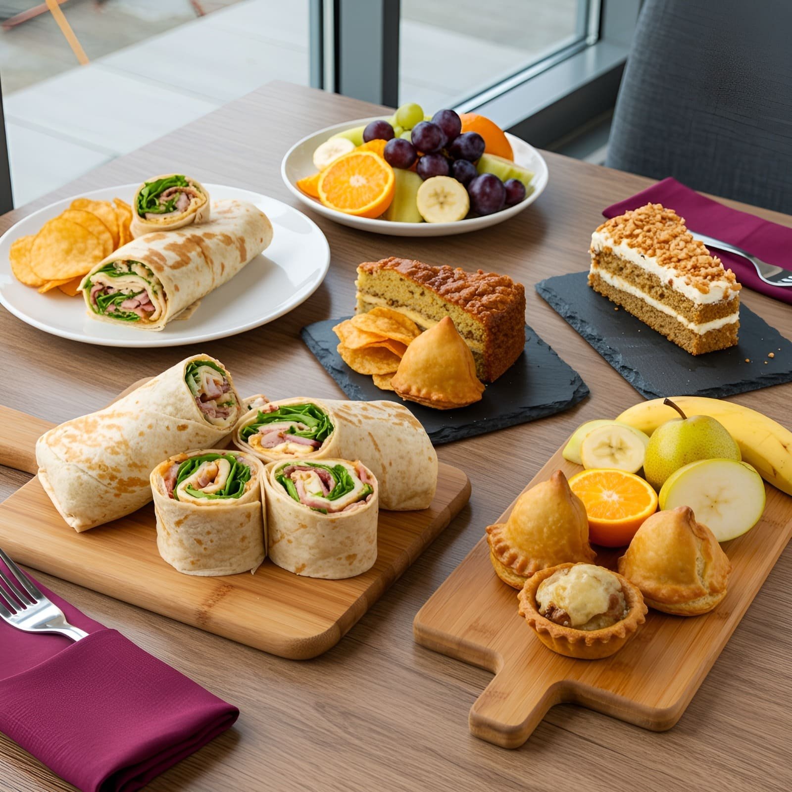 Serves 1 – Sandwiches (1 rounds of various fillings), crisps, cake & 3 nibbles (e.g., mini cornish pastie, sausage roll, savoury egg, vegetable samosa, cheddar puff, Chicken Satay, vol au vent, Vegetable Satay, Veggie bite, Selection of canapés, pizza puff, Vegetable Spring Roll, Quiche & Onion Bhaji’s)