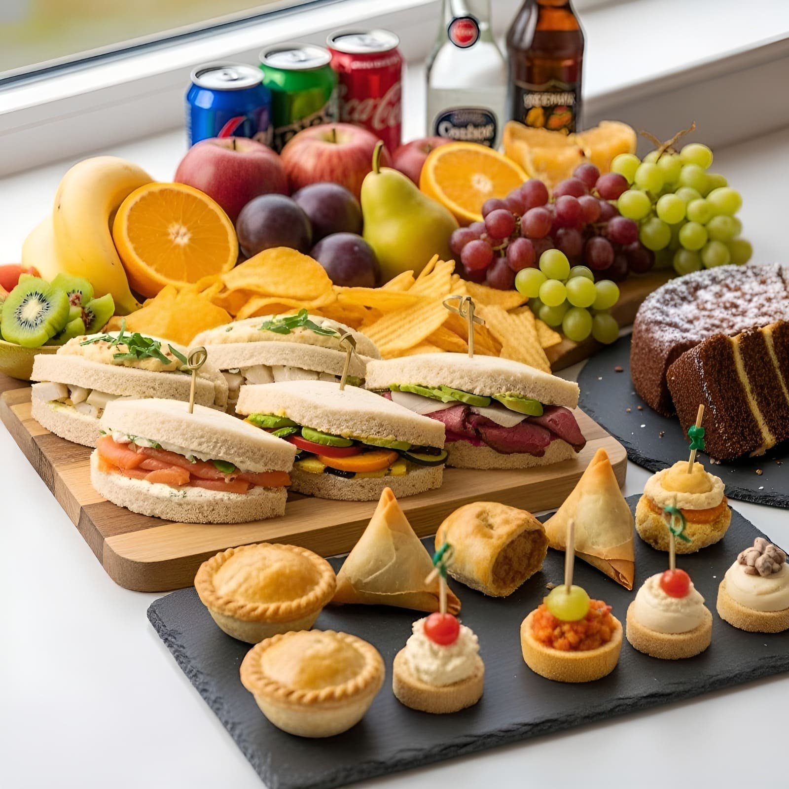 Serves 1 – Sandwiches (1.5 rounds of various fillings), Fruit (apple, orange, banana, grapes, pear, plum), crisps, cake & 7 nibbles (e.g., mini cornish pastie, sausage roll, Savoury egg, vegetable samosa, cheddar puff, Chicken Satay, vol au vent, Vegetable Satay, Veggie bite, Selection of canapés, pizza puff, Vegetable Spring Roll, Quiche & Onion Bhaji’s)